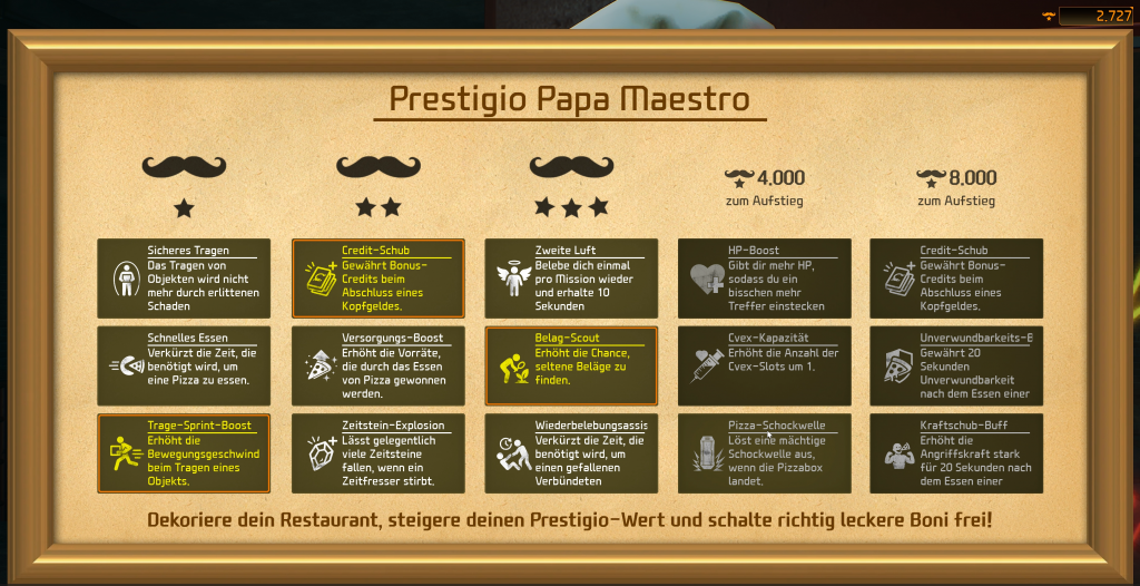 Die Einrichtung unserer Pizzeria fällt zwar spannend aus, da wir den Laden nach unserem Belieben einrichten können. Allerdings bringt das zum einen nur einen optischen Mehrwert und je nach Einrichtungsmenge erhalten wir noch weitere Bonis, die wir unserem Charakter gutschreiben können. Auch das Pizza backen fehlt natürlich nicht, bringt aber auch wiederum nur Buffs für den nächsten Einsatz mit sich. An der Stelle fehlt mir vielleicht etwas das Ziel vom Game. Denn wir werden unseren Laden gefühlt nie fertig eingerichtet haben und eröffnen können. Daher fehlen mir auch etwaige Gäste, die man vielleicht während den Missionen noch nebenbei bedienen könnte.