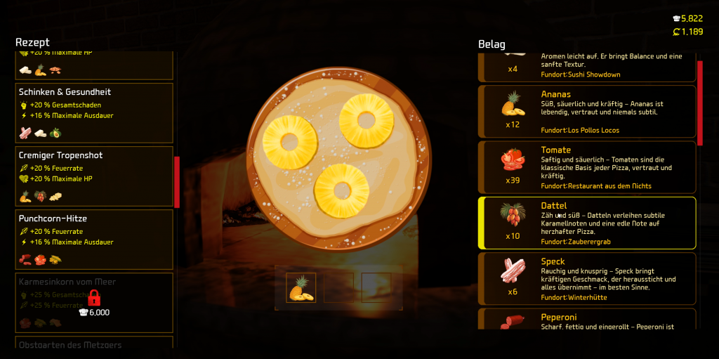 Des Weiteren haben wir auch einen Ofen vor Ort, den wir bedienen können. Nach Abschluss mehrerer Missionen werden wir mehr Pizzarezepte freischalten, wofür wir die gesammelten Zutaten auch nutzen können. Natürlich backen wir diese nicht für irgendwelche Gäste oder für Lau, sondern werden auch hierfür nützliche Buffs für den nächsten Einsatz erhalten.