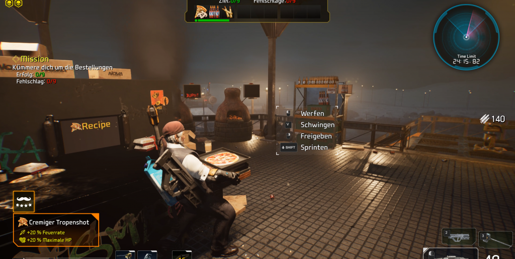 In einer Mission werden wir damit beauftragt Pizza zu backen und diese an die Kundschaft auszuliefern. Die Kochelemente sind allerdings sehr einsteigerfreundlich aufgebaut und man wird nur einfache Rezepte mit wenig Zutaten zubereiten müssen. Im Beispiel der Pizza wird es nur eine mit Pepperoni oder Pilzen geben, die wir zusammen mit Käse belegen und im Ofen fertigbacken müssen. Der Bestellung muss dann nur noch Munition und Cola oder Bier hinzugefügt werden, und schon ist man fertig. Um dem Ganzen noch ein wenig Hektik einzuhauchen, muss nur darauf geachtet werden, dass die Bestellung korrekt ausgeführt wird und die Pizza im Ofen nicht anbrennt. Der klare Unterschied zu Titeln wie Overcooked stellt der kämpferische Part dar. Denn während unserer Mission werden wir von so genannten Time-Reapern permanent angegriffen und müssen uns zur Wehr setzen. Je nach Auswahl des Schwierigkeitsgrades kann dies durchaus herausfordernd wirken, wenn nebenbei die Pizza fast verbrennt, wir aber noch etliche Gegner vor dem Ofen beseitigen müssen.