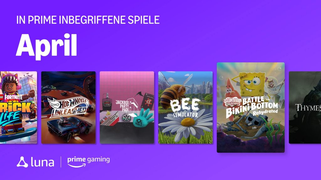 - Prime Gaming-Mitglieder aus den USA, Großbritannien, Kanada, Deutschland, Frankreich, Italien, Spanien, Österreich, den Niederlanden und Polen können im April umsonst über Amazon Luna auf folgende Titel zugreifen: SpongeBob: Battle for Bikini Bottom – Rehydrated, HOT WHEELS UNLEASHED™, Bee Simulator, Thymesia, The Jackbox Party Pack 6, Fortnite OG, Fortnite Ballistic, LEGO® Fortnite Brick Life, Fortnite Battle Royale,Fortnite Festival,LEGO® Fortnite Odyssey, Rocket Racing, Fortnite, Trackmania Starter Access, Fallout New Vegas: Ultimate Edition und Fallout 3: Game of the Year Edition.